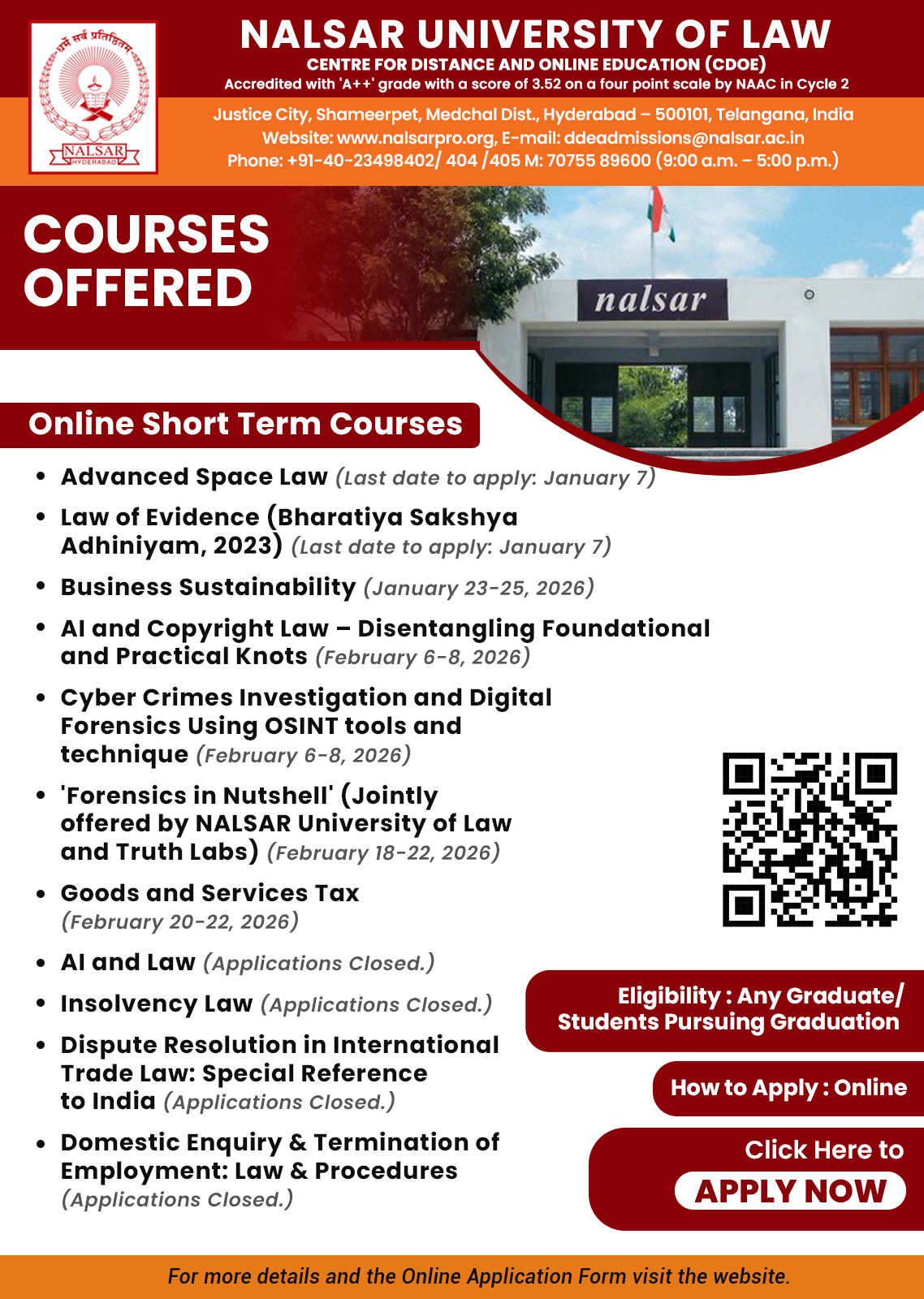 The programmes a blend of online and face to face contact programmes are structured with print, electronic and web based materials and will cater to legal and non-legal professionals. The Courses to be handled by experts from Academia, Legal practioners and Industry experts will impart content equalling residential courses.